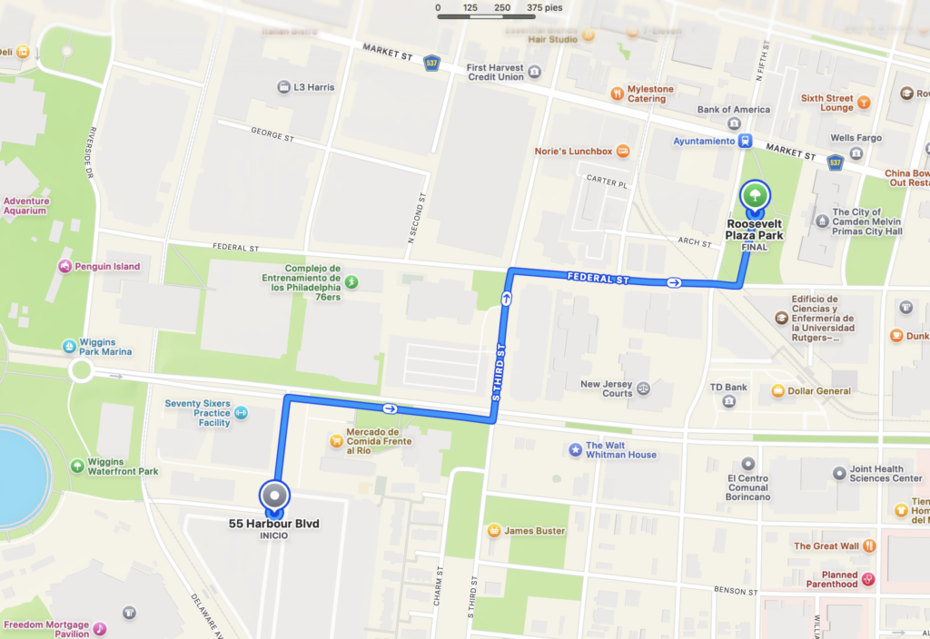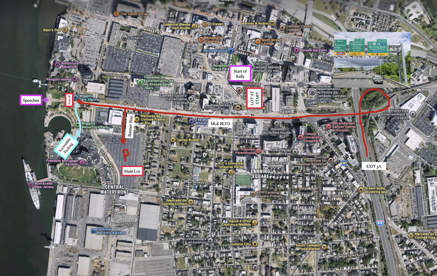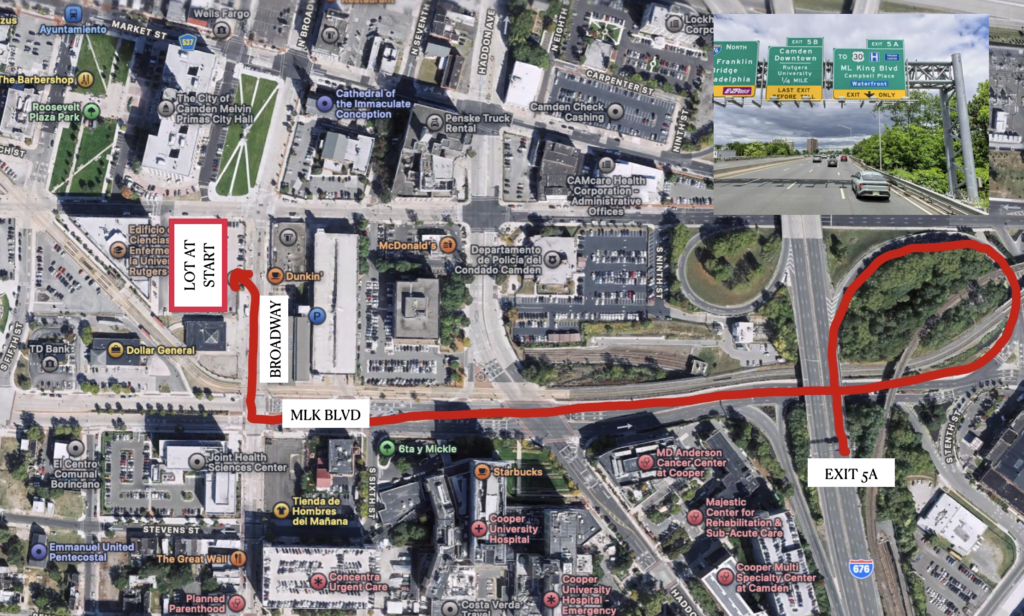 If you are coming down 676 towards the Ben Franklin Bridge, get off at exit 5A as shown above. Head down MLK BLVD until you reach Banner Way. Turn left onto Banner Way and make your way into the parking lot. If you are planning to march with us, walk back up to City Hall as shown below: