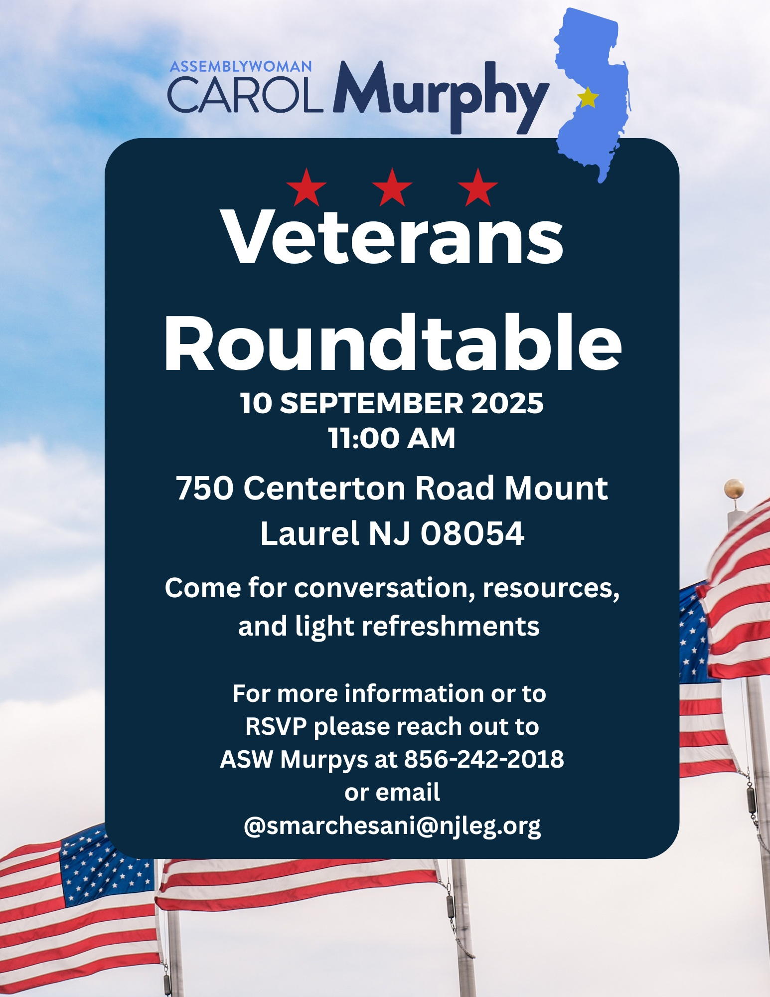 Veterans Roundtable September 10th Sponsored by Assemblywoman Carol Murphy (More Info)